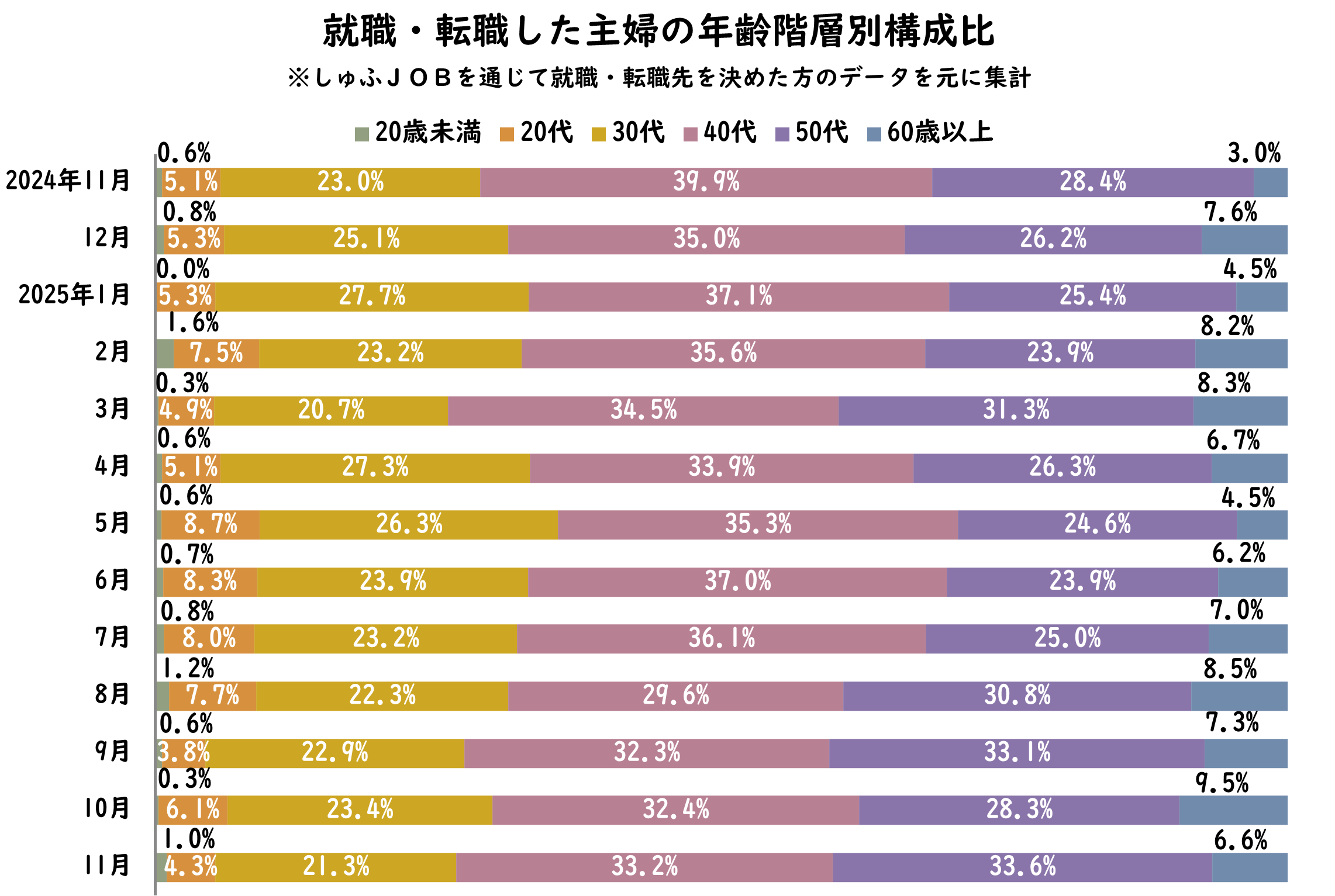 転職しゅふの平均年齢は、前月比+0.2歳、前年同月比+1.3歳の46.0歳となりました。