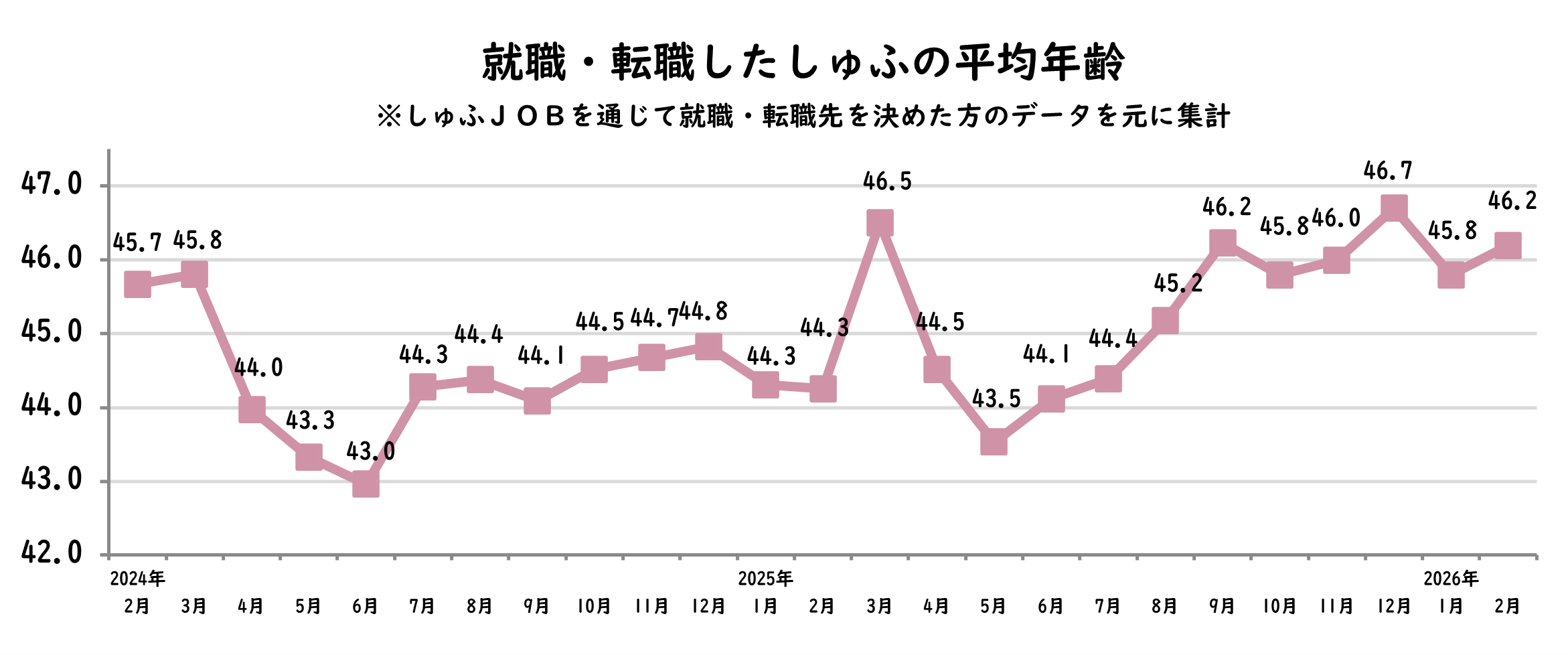 【転職しゅふの平均年齢調査 2026年2月】46.2歳(前月比-0.9歳)