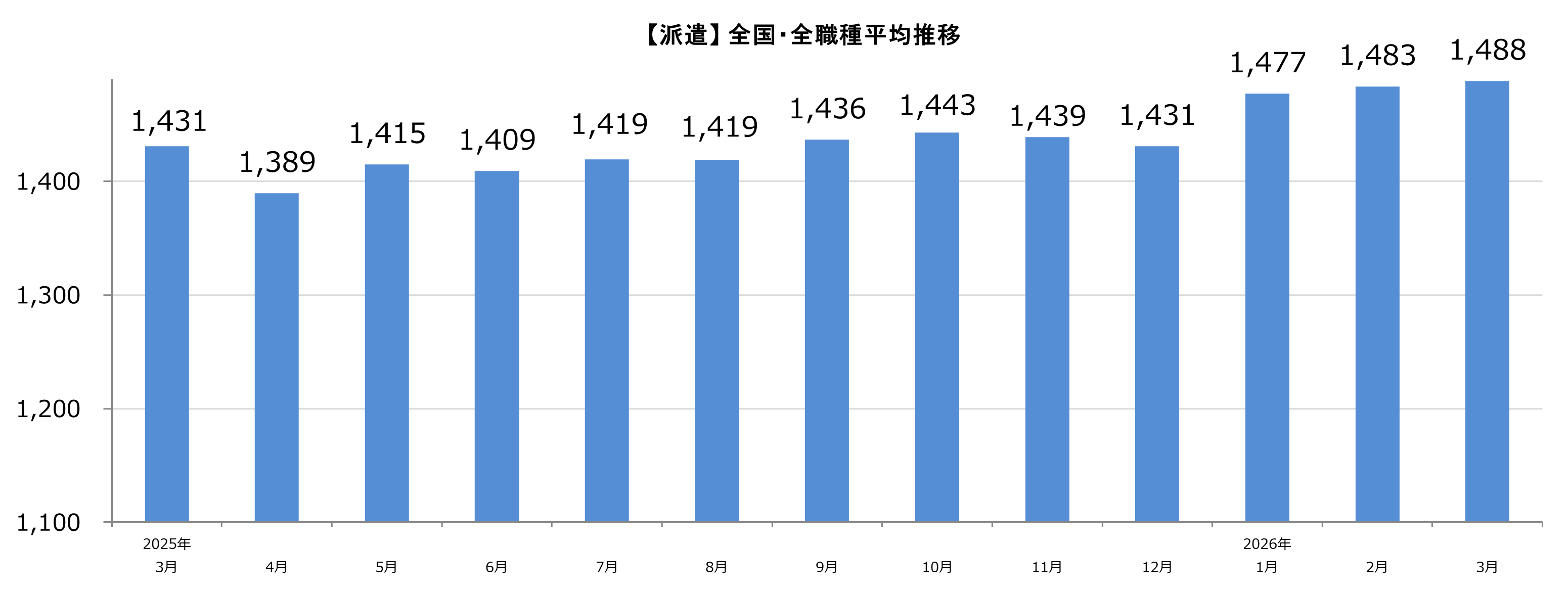 【派遣】全国・全職種平均時給は1,488円。前月比+5円。前年同月比+57円。